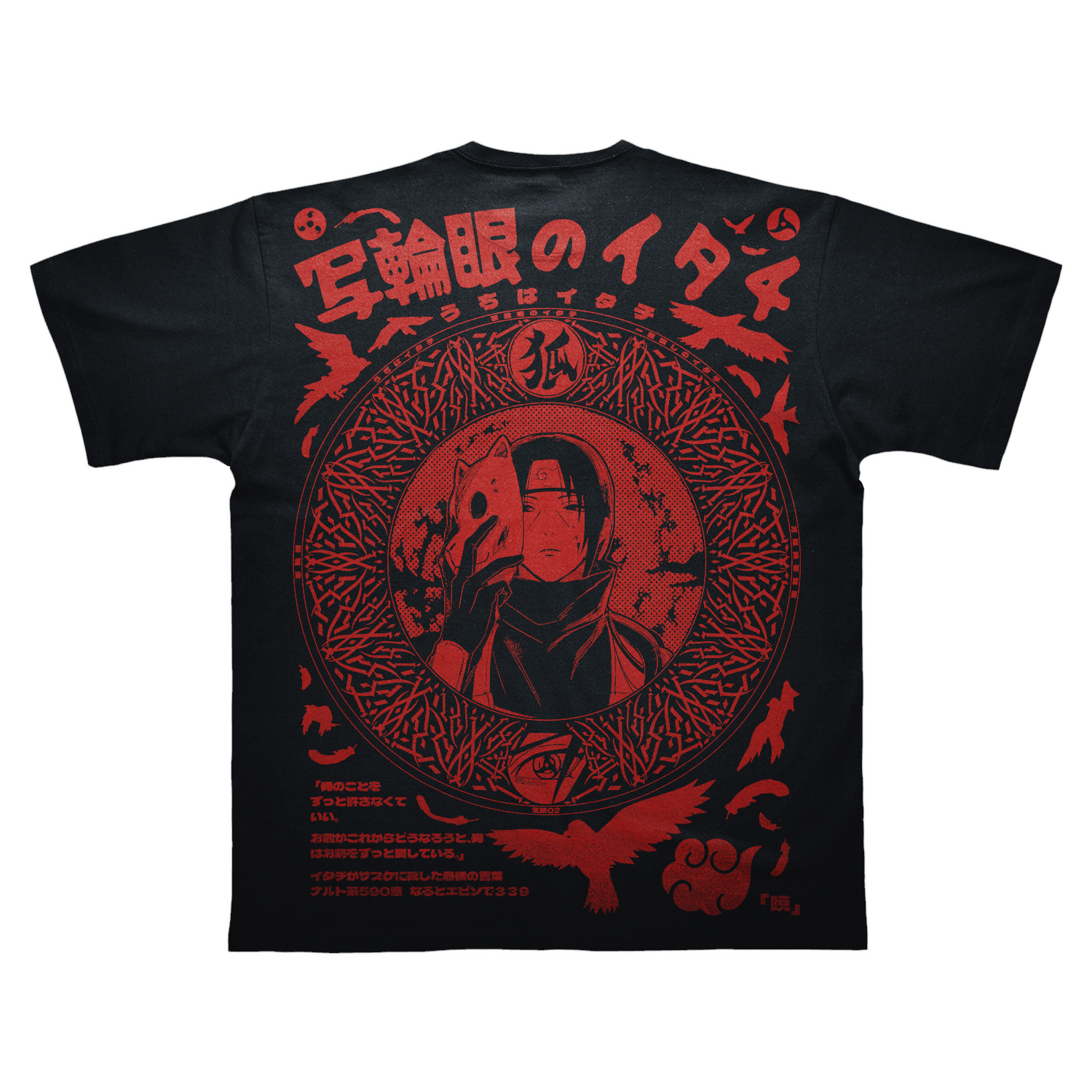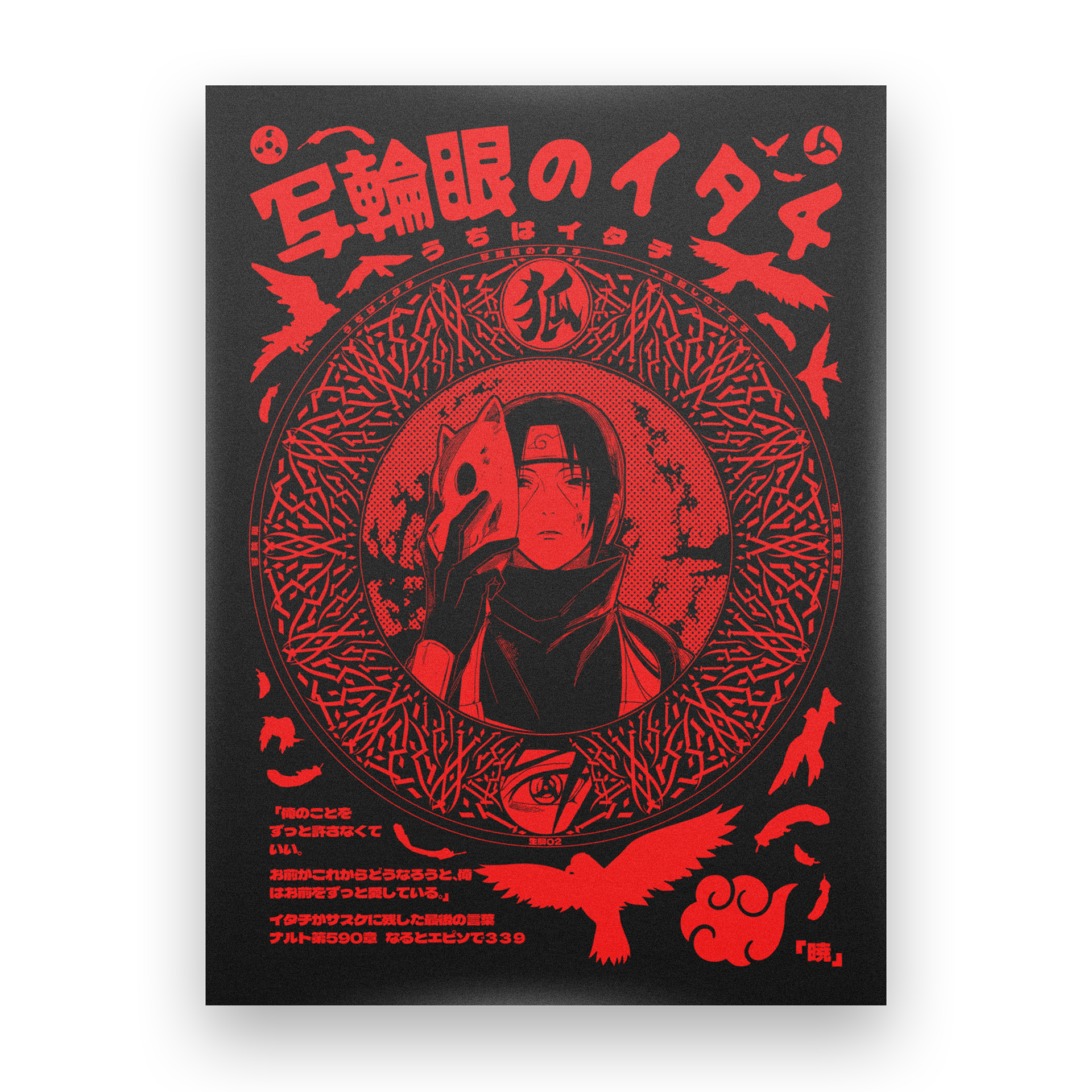 This single color design is based on the very famous character "uchiha itachi" from the very famous anime "naruto." It uses crow silhouettes, feathers, the uchiha seal, sharingans, and akatsuki symbols, with the main background being the moon.